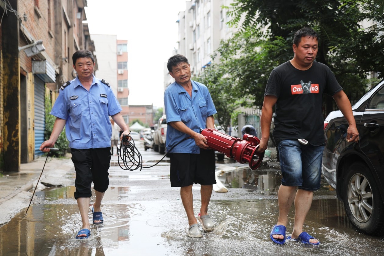 7月22日,在市區安裝公司家屬院,工作人員正在搬運水泵準備抽積水。
