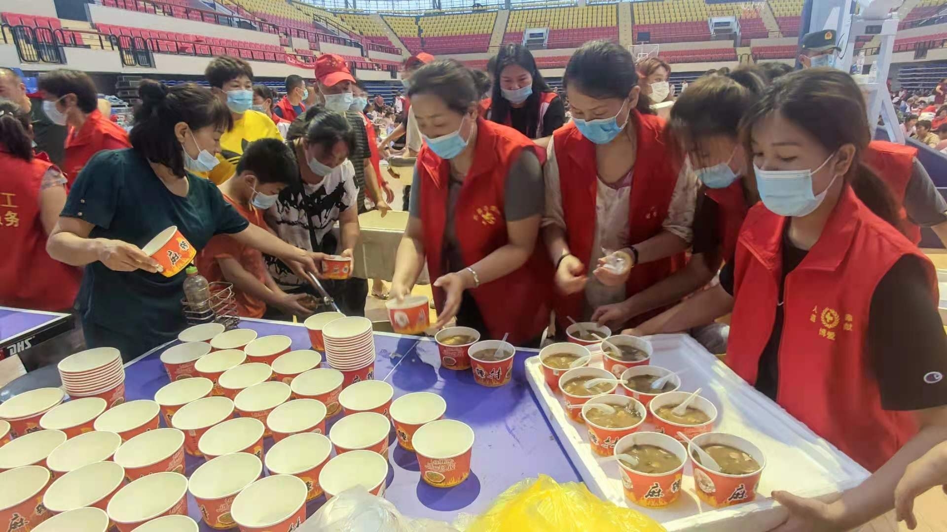 7月22日晚,長葛市體育場受災(zāi)群眾安置點,愛心人士為受災(zāi)群眾送來油饃和胡辣湯。 孫江鋒 攝