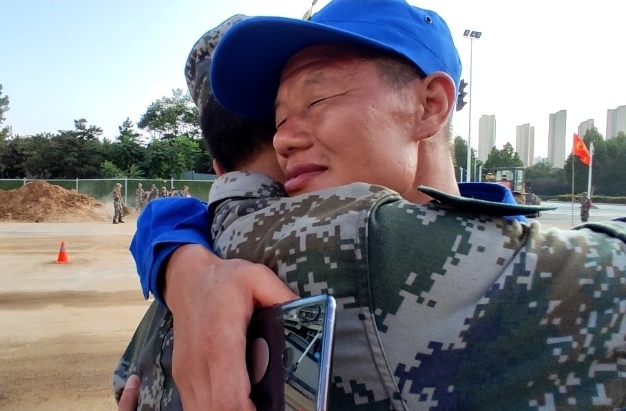 7月24日下午,在鄭州防汛救災(zāi)一線,參與搶險的楊根思部隊列兵楊帆和身為京山飛鷹救援隊隊員的父親楊海燕相逢,父子倆緊緊相擁。 季鵬 鄭夏云 攝