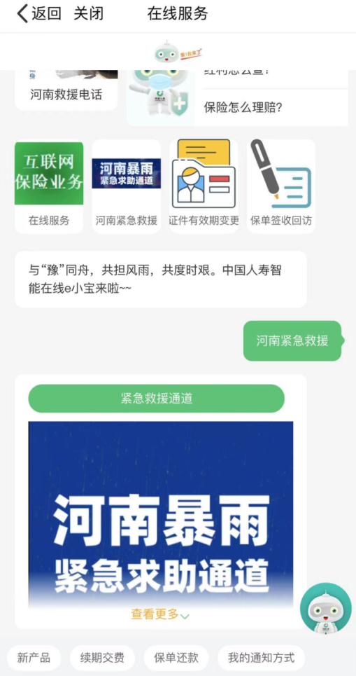 在中國人壽壽險APP、中國人壽保險股份有限公司官微(微信號:baoxian-95519)等互聯(lián)網(wǎng)在線服務(wù)界面顯著位置同步開通緊急救助通道,求助者無需登錄就能夠獲取救援電話號碼,或一鍵進(jìn)入《河南暴雨緊急救助通道》(人民日報版)在線提交求助信息。