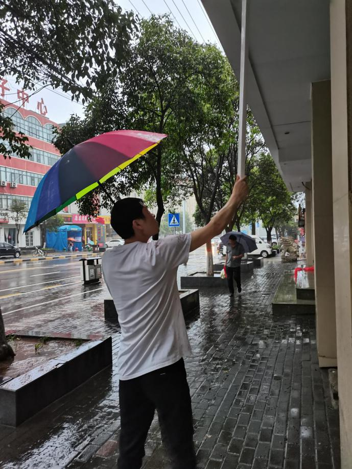 晚上7點(diǎn)多鐘,當(dāng)他再次檢查柜面情況時,發(fā)現(xiàn)雨水正從外墻及玻璃頂部漏入大廳。為避免柜面積水導(dǎo)致漏電及財產(chǎn)損失,影響到為客戶提供正常、安全的服務(wù),陳廣建冒雨到外面查找漏雨原因。剛走出大廳,頃刻全身就被淋濕透了。為了迅速排查,他不顧個人安危,搭起了扶梯。此時,頭頂電閃雷鳴,在雨水的沖擊下,雙眼根本無法完全睜開。陳廣建還是毅然決然地攀爬到了屋頂,最后發(fā)現(xiàn)是門頭前沿下水管被雜物堵塞造成。