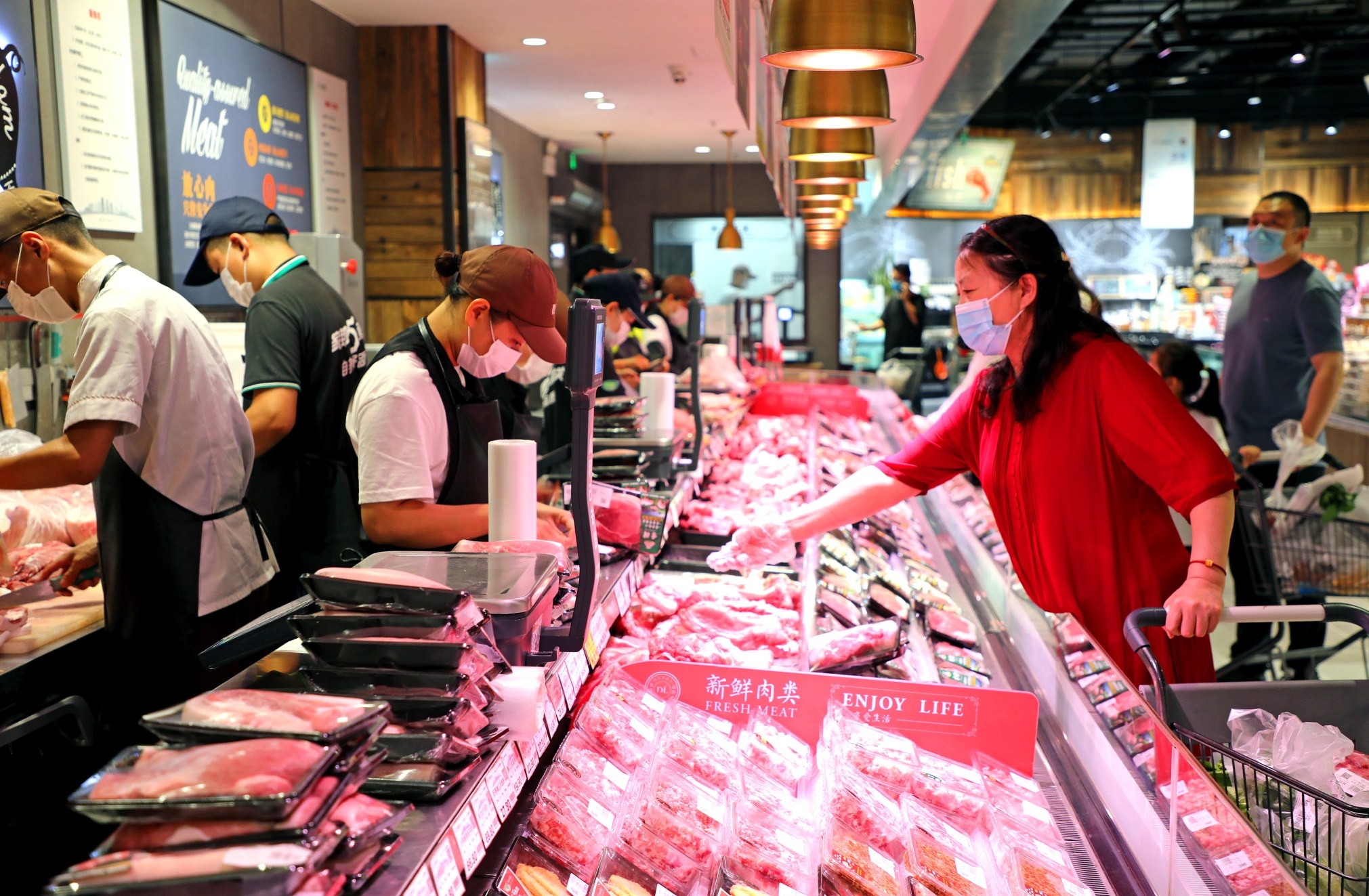 連日來,部分許昌市民擔心“菜籃子”“米袋子”,8月3日,記者探訪了解到,許昌市區各大主力超市門店備貨充足,供應鏈全鏈條暢通……市民不必囤積生活必需品,完全可以從容購物消費,以免造成浪費。圖為市民正在魏文路胖東來云鼎店超市內購買鮮肉。 本報記者 譚宜姝 攝