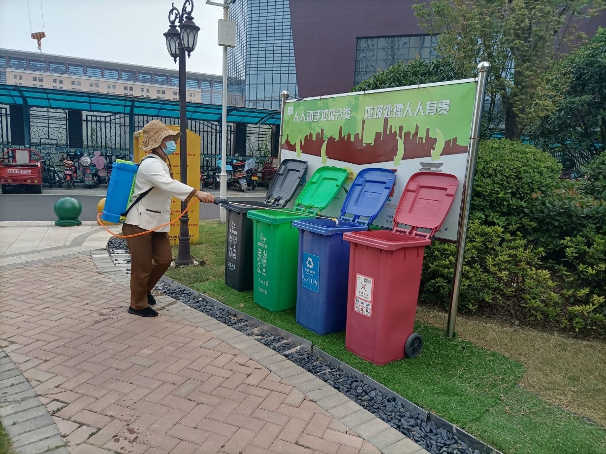 恒達物業各項目規范設置廢棄口罩回收處,對單元門、電梯間、步梯扶手、快遞柜等重點區域進行全面消毒,每天消毒不少于3次。