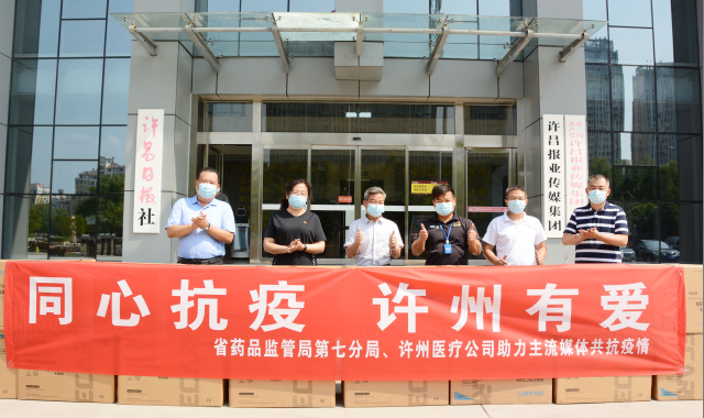 口罩作為重要的疫情防控物資,對(duì)于一線工作人員來(lái)說(shuō)必不可少。8月6日,省藥監(jiān)局第七分局聯(lián)合許昌許州醫(yī)療器械有限公司向許昌日?qǐng)?bào)社捐贈(zèng)口罩2.8萬(wàn)只,助力一線新聞?dòng)浾咴诋?dāng)前疫情形勢(shì)下開(kāi)展工作。圖為口罩捐贈(zèng)交接現(xiàn)場(chǎng)。 孫學(xué)濤 攝
