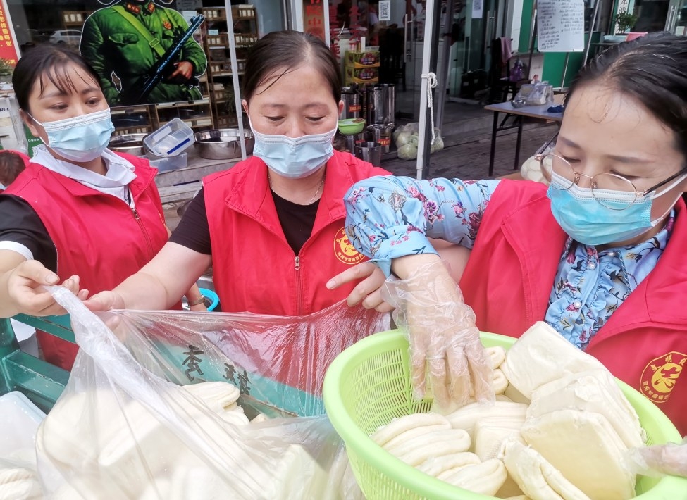 8月15日,許昌市文峰社區愛心粥屋的幾名志愿者正在為一線防疫人員準備荷葉餅等餐食。