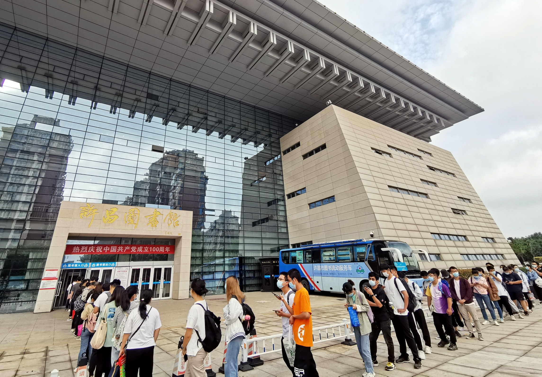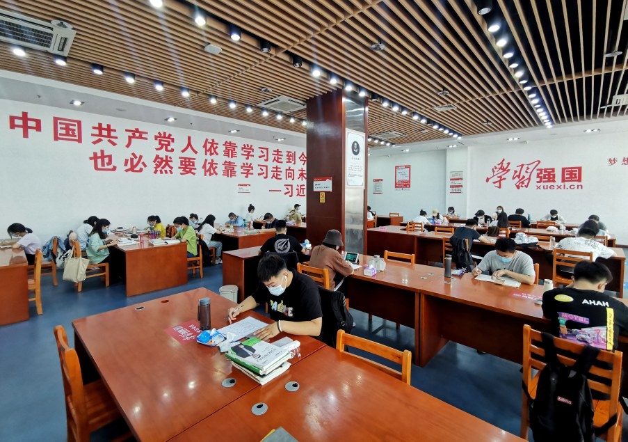 8月28日,許昌市圖書館恢復開放。入館人員須出示健康碼和行程碼、體溫正常。隨著我市疫情防控常態化,市民生活逐步回歸正常。圖為市民排隊有序入館和讀者在圖書館自習區學習。本報記者 喬利峰 攝