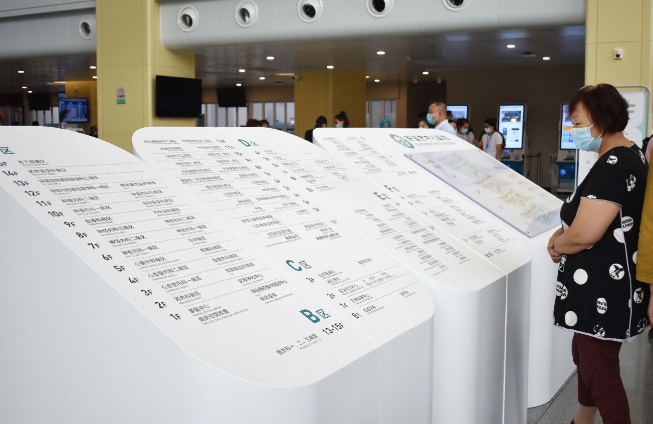 為了讓前來就醫的患者能快速找到就診科室位置,門診大廳入門處還設有醒目的樓層分布示意圖和科室樓層索引,大廳兩側分別設有門診科室分布示意圖,門診大廳正中設有導醫臺。另外,門診大廳東側設有門診專家坐診表及專家介紹電子屏、自助服務機、藥房,西側設有收費處。