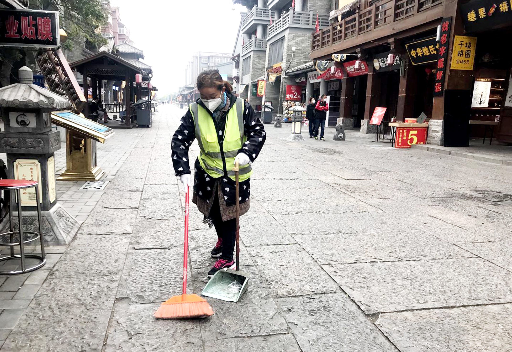 10月19日,在市區曹魏古城內,文明志愿者清掃垃圾,確保路面干凈整潔。