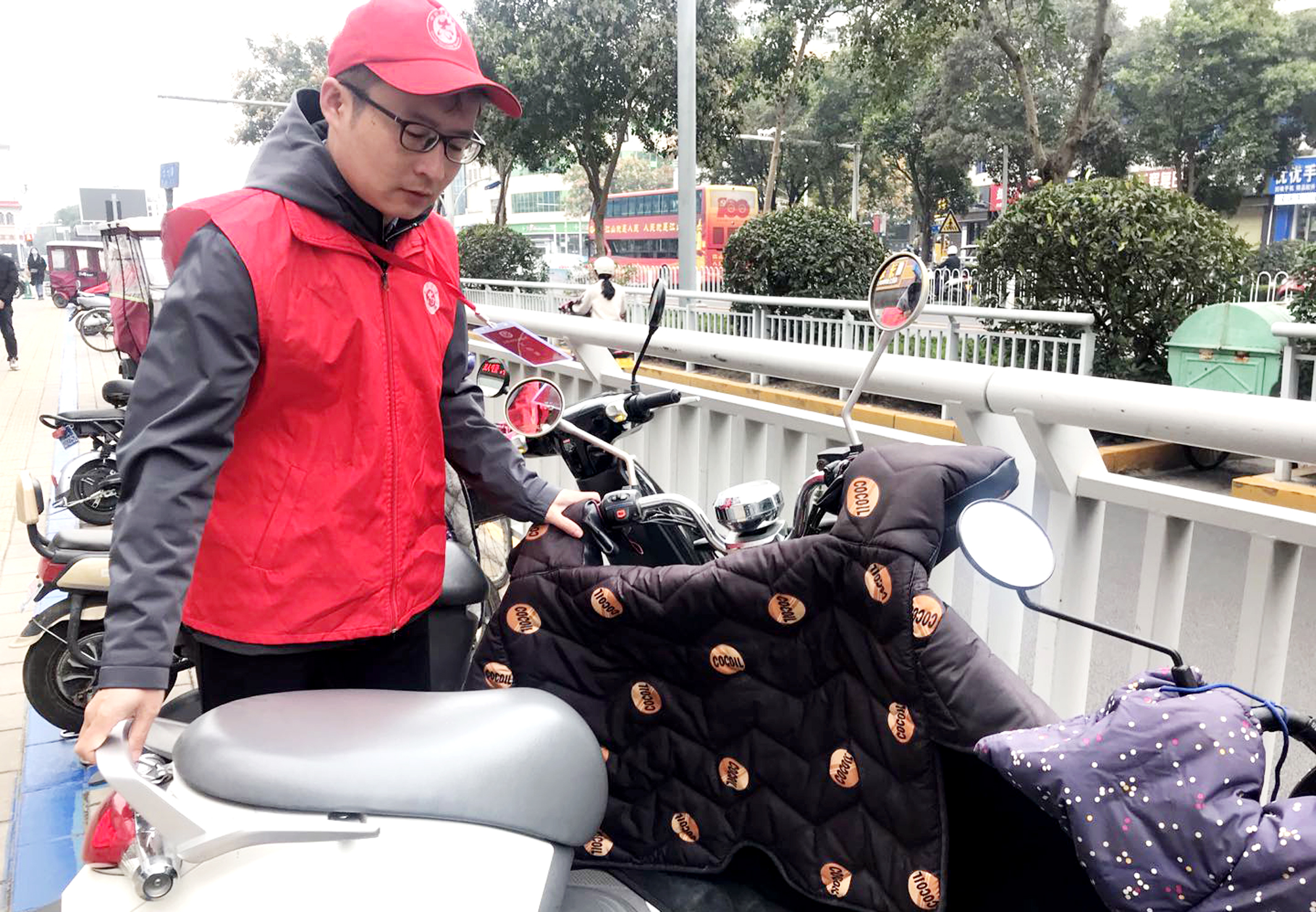 10月19日,在市區七一路上,文明志愿者擺放電動車,確保停車入位、朝向一致。