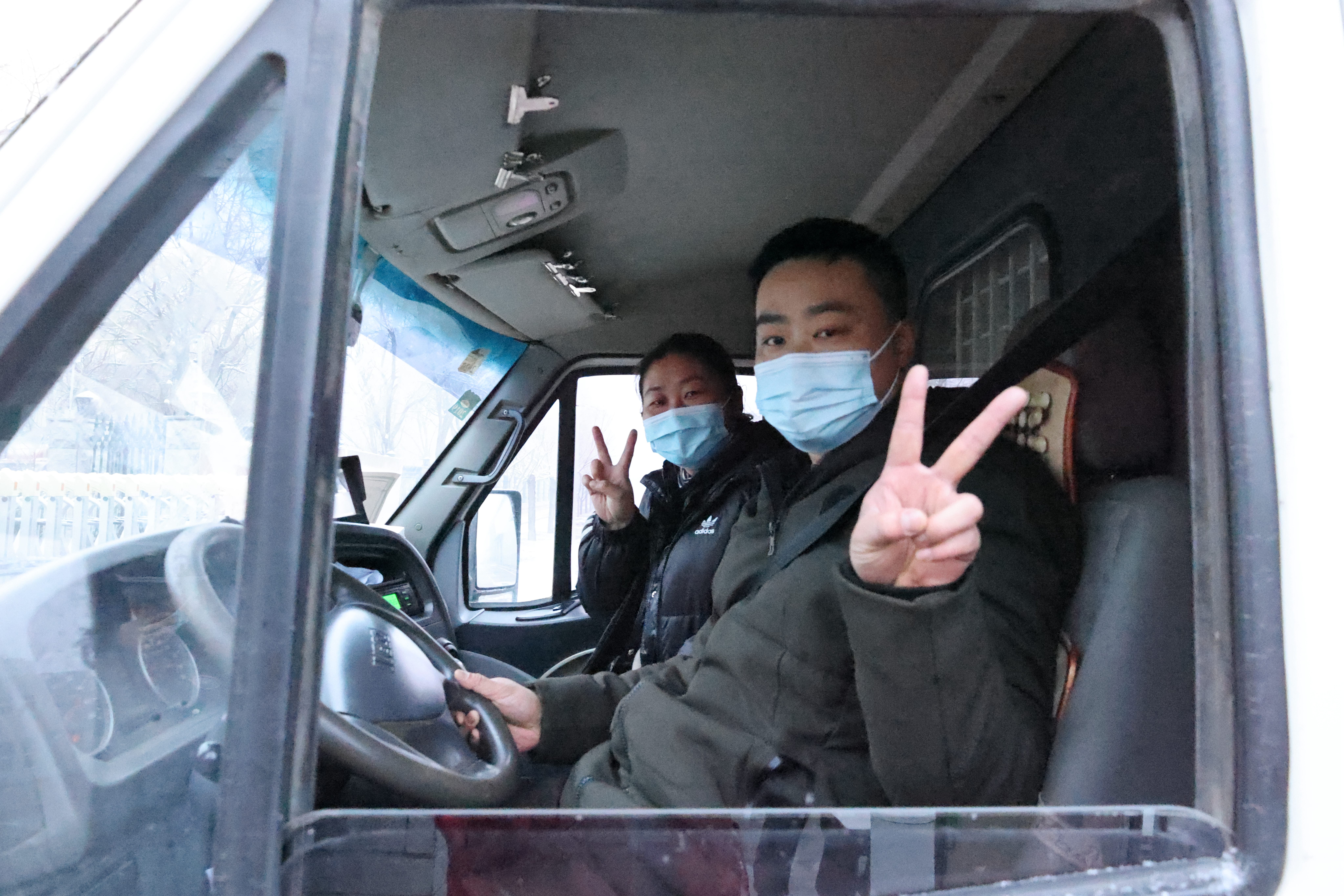 02 今天是一個月來第一次送貨到戶,昨夜剛下過雪,早晨大霧彌漫,送貨員關敏、黃曉勇比出勝利手勢預祝順利。