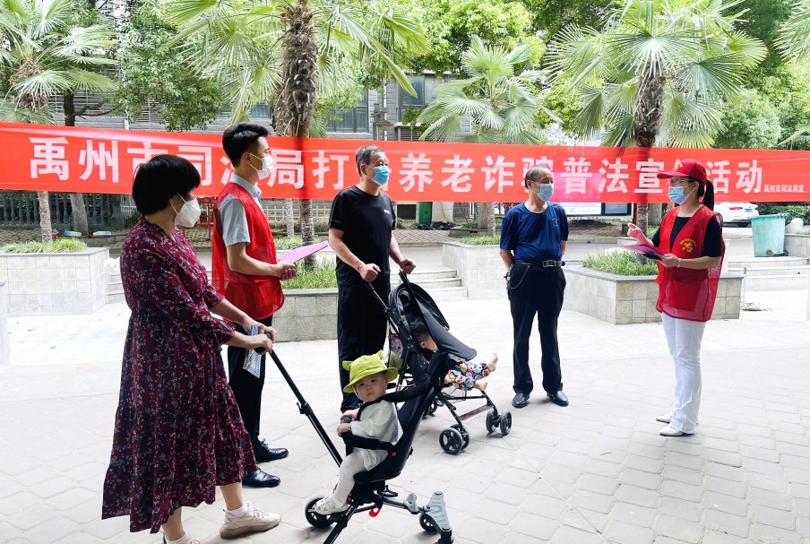 6月8日,禹州市司法局普法志愿者走進(jìn)社區(qū),向群眾發(fā)放防范養(yǎng)老詐騙宣傳手冊(cè),提醒群眾勿輕信陌生人的花言巧語(yǔ),不要抱有“占小便宜”的心理。韓曉雅 攝