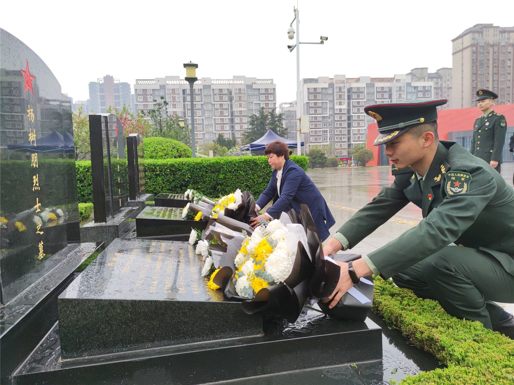 4月3日,楊根思連官兵代表與楊根思雙擁社區工作人員一起,冒雨前往許昌烈士陵園,為維和烈士李磊、楊樹朋掃墓。2016年,在南蘇丹維和戰場上,李磊、楊樹朋壯烈犧牲。自2017年開始,為兩位烈士掃墓,已成為楊根思雙擁社區的傳統。 許廷合 攝