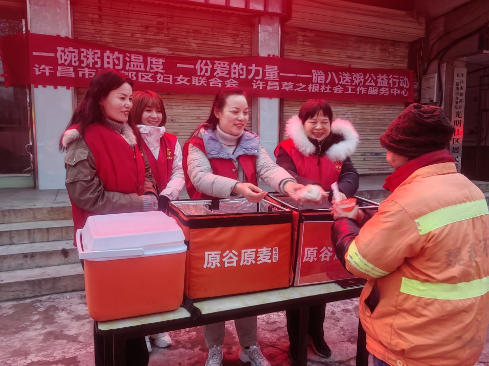 魏都區婦聯聯合許昌草之根開展送粥活動 本報記者 許廷合 攝