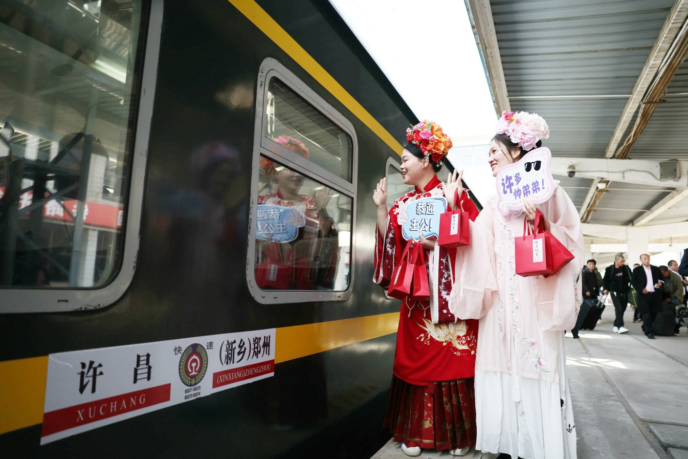 本報訊 (記者 孫江鋒)3月29日10時12分,隨著一聲悠長的鳴笛聲響起,由鄭州開往許昌的K5371次列車準時抵達許昌火車站。隨著游客有序下車,站臺上一下熱鬧起來。志愿者身著漢服,頭戴簪花,為游客送上鈞瓷、銀梅可樂等許昌特產。