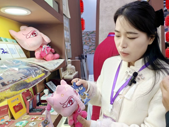許昌博物館講解員汪潔琳向記者介紹“饕餮”系列文創(chuàng)產(chǎn)品。