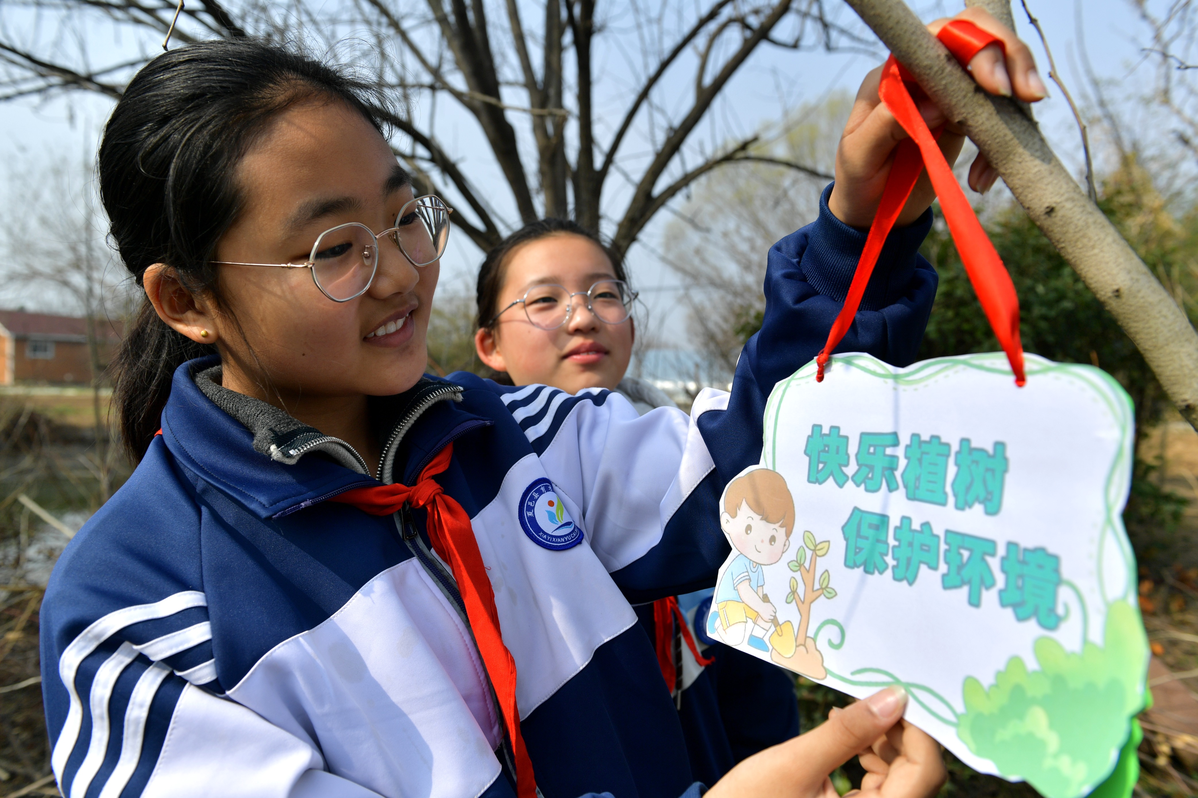 3月11日,小學生在河南省商丘市夏邑縣育才學校教育實踐基地參加義務植樹護樹活動。 植樹節即將來臨,各地開展植樹活動,為春天增綠添彩。 新華社發(苗育才 攝)