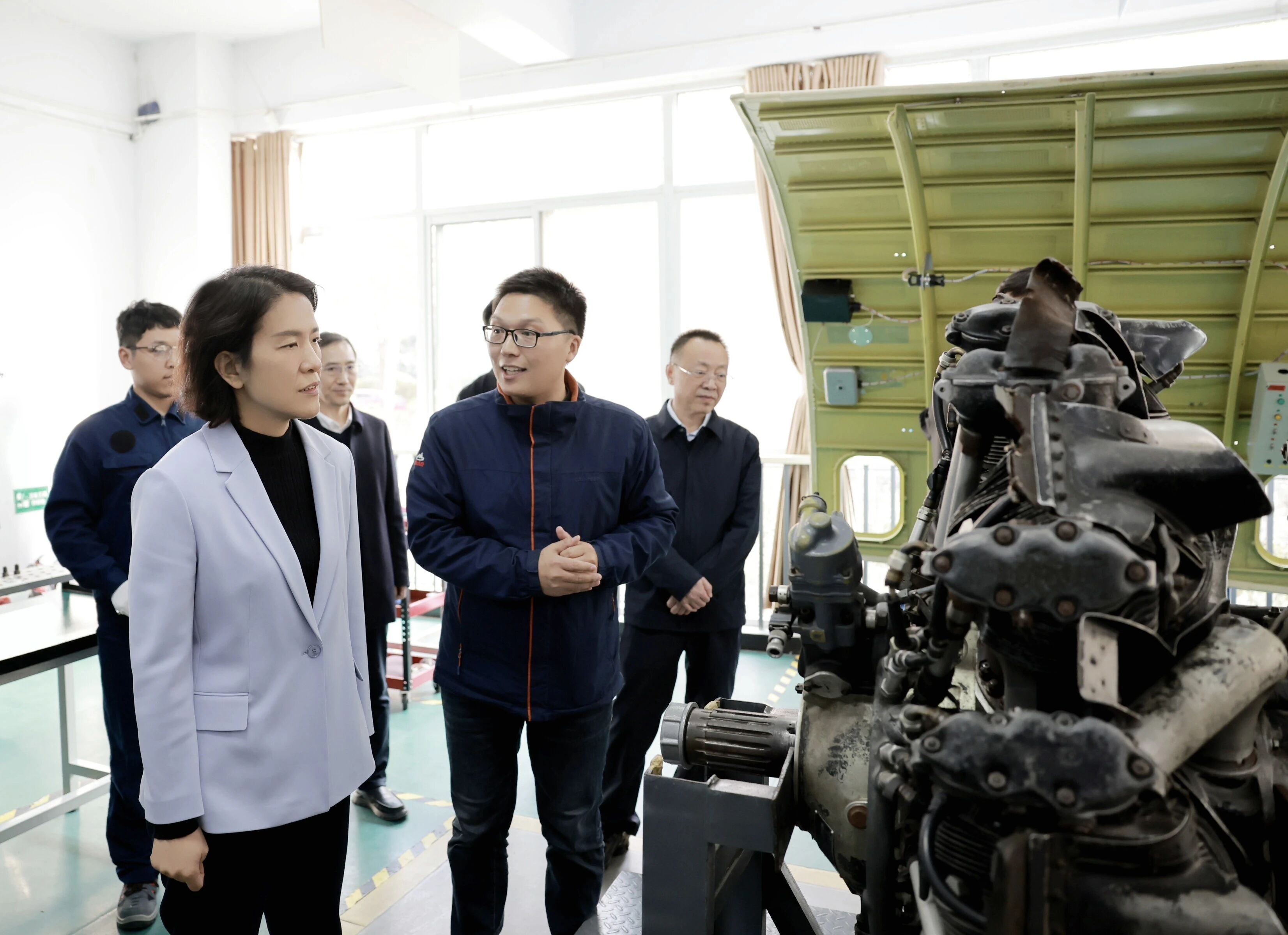 航空工程學(xué)院建有無(wú)人機(jī)應(yīng)用技術(shù)中心、航空服務(wù)實(shí)訓(xùn)中心、飛機(jī)發(fā)動(dòng)機(jī)維修中心等,學(xué)生正在老師指導(dǎo)下進(jìn)行實(shí)訓(xùn)操作。楊小菁實(shí)地察看了解情況,并與師生親切交談,指出要充分發(fā)揮區(qū)位、交通、產(chǎn)業(yè)等優(yōu)勢(shì),加強(qiáng)航空產(chǎn)業(yè)全產(chǎn)業(yè)鏈人才培養(yǎng),推動(dòng)教育鏈、人才鏈與產(chǎn)業(yè)鏈、創(chuàng)新鏈深度融合,以人才促創(chuàng)新、引產(chǎn)業(yè),為經(jīng)濟(jì)發(fā)展培育增長(zhǎng)點(diǎn)、注入新活力。