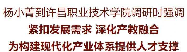 11月3日,市委書記楊小菁到許昌職業(yè)技術(shù)學(xué)院調(diào)研職業(yè)教育發(fā)展情況,強(qiáng)調(diào)要深入學(xué)習(xí)貫徹黨的二十屆四中全會(huì)精神和習(xí)近平總書記關(guān)于教育的重要論述,緊扣發(fā)展需求,深化產(chǎn)教融合,努力培養(yǎng)造就更多高素質(zhì)高技能人才,為構(gòu)建現(xiàn)代化產(chǎn)業(yè)體系提供有力支撐。市委副書記、市委教育工委書記趙軍參加。