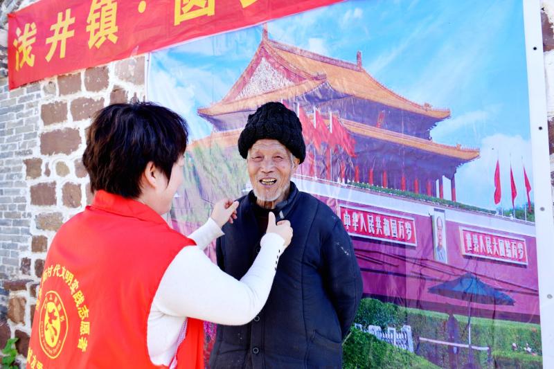 淺井村一座古建筑的紅石墻上,掛著一塊“北京天安門”背景布,在初冬的陽光下顯得格外“耀眼”。不遠處,身穿紅馬甲的志愿者李俊安、李亞星正在給老人理發。理完發的老人們已自覺排好隊,等著跟“北京天安門”合影。