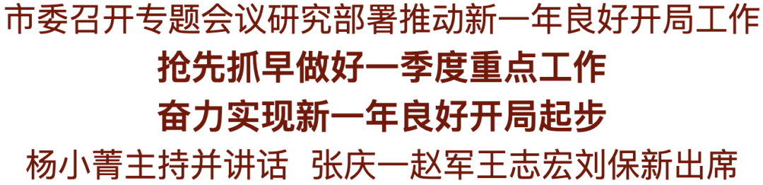 1月31日,市委召開專題會議,傳達貫徹全省推動新一年良好開局動員部署會精神,動員全市上下以“人一之、我十之”的進取心和“一日無為、三日不安”的緊迫感,堅決打好冬春季攻保戰役,全力以赴做好一季度各項工作,確保新一年開好局、起好步。市委書記楊小菁主持會議并講話,市長張慶一傳達全省會議精神,市委副書記趙軍、市人大常委會主任王志宏、市政協主席劉保新出席。