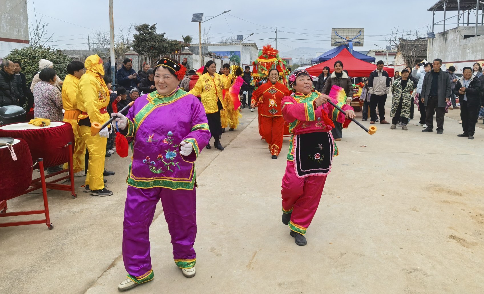 當(dāng)天是村里一年一度的傳統(tǒng)廟會。伴隨著鏗鏘的鑼鼓聲,舞龍隊伍從村口騰躍而來,金鱗在陽光下閃閃發(fā)光;秧歌隊的大娘們踩著鼓點(diǎn)扭得歡實,紅綢帶甩得噼啪響。孩子們舉著糖葫蘆在人群里鉆來鉆去,叫賣聲、談笑聲、鑼鼓聲混合在一起,把這個千年古村攪得熱氣騰騰。