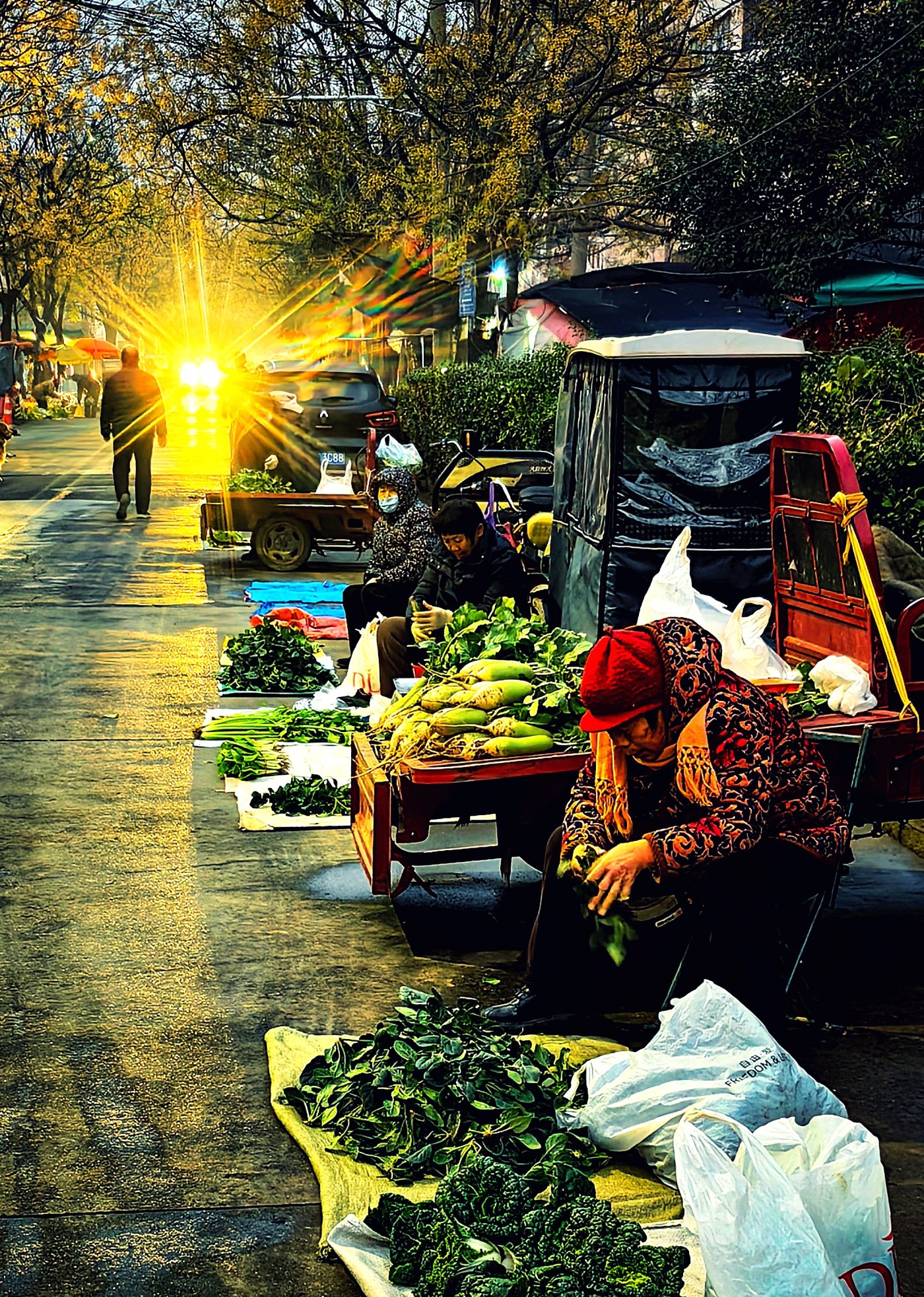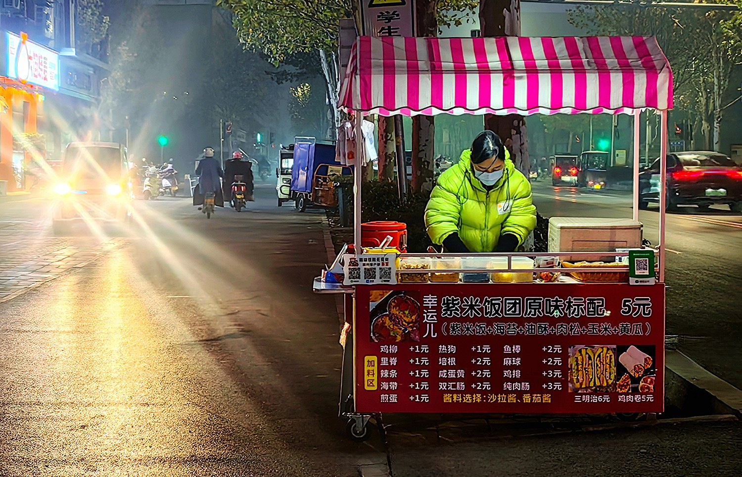 天未破曉,寒意最盛之時,望田路菜市場已漸有生機。賣菜攤販早已將分揀整齊的蔬菜擺上攤位,沾著露水的青菜在燈光下泛著新鮮的綠意,他們呵著白氣,耐心等候第一波市民的到來。不遠處的早餐店燈火通明,水煎包子的焦香混著胡辣湯的醇厚撲面而來,店主忙碌的身影在蒸汽中穿梭,用熱氣騰騰的食物喚醒城市的清晨。