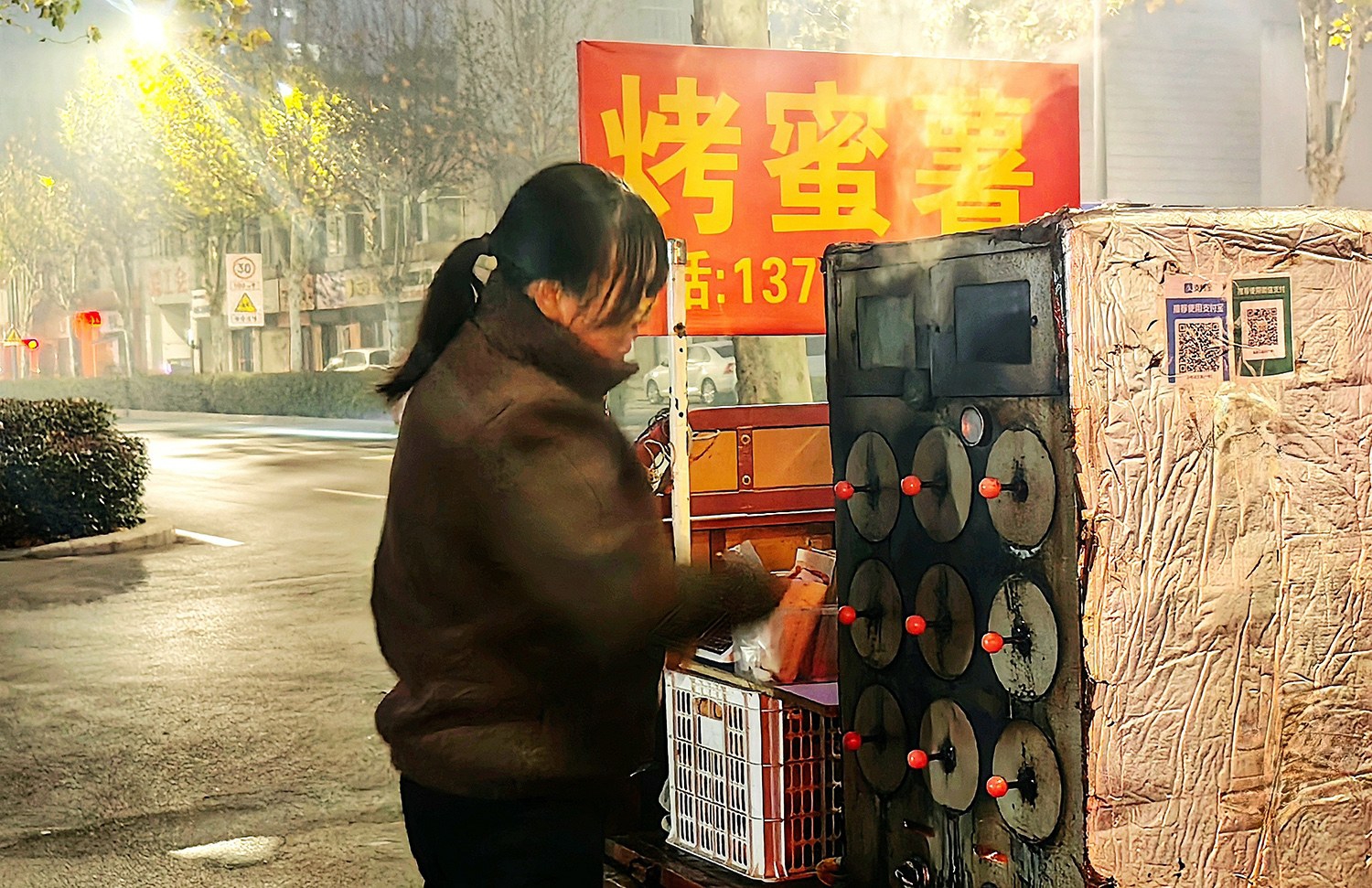 冬至過后,蓮城的寒意在朝暮間愈發(fā)濃烈。深夜的大街褪去喧囂,稀疏的行人裹緊衣衫匆匆而過,唯有街角的烤薯攤兒還亮著暖黃的燈,烤箱里的炭火跳躍,烤薯的甜香在寒風中彌漫,攤主搓著凍紅的手,目光在熱氣中望向路口,為晚歸人留一盞暖光。